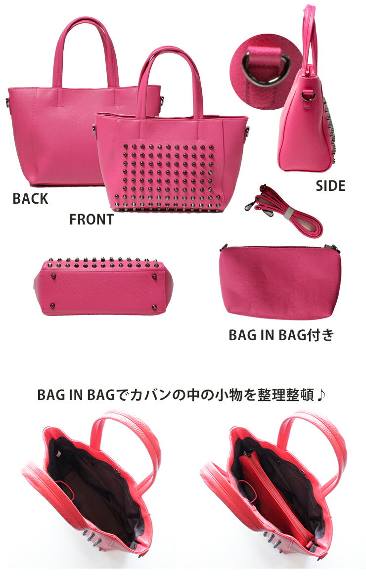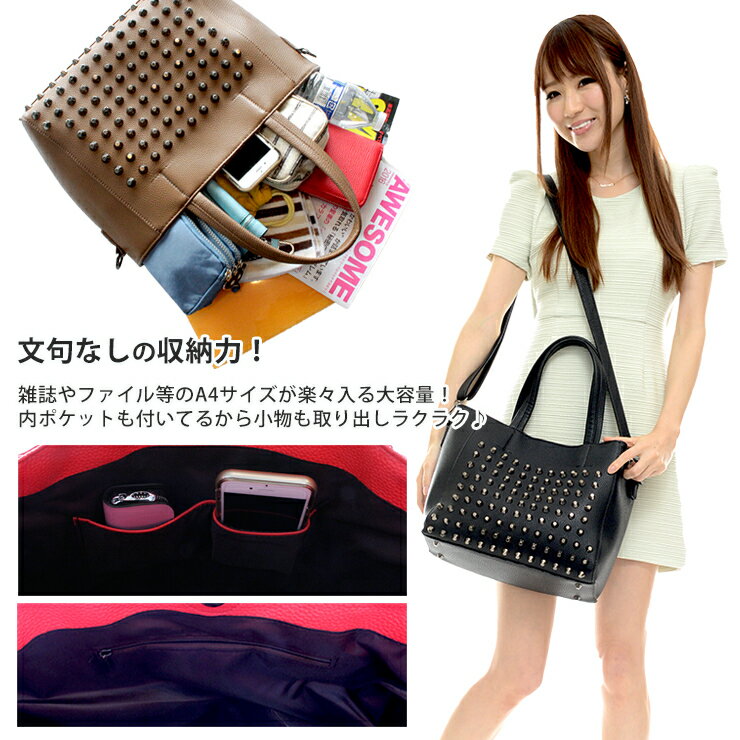 【展示品】 スタッズ付きバッグ トートバッグ ショルダーバッグ 2WAY 大容量 収納 鞄 BAG 高級感 ストラップ付き シンプル 黒 白 ブラック ママバッグ 小物 女性 レディース メンズ インナーバッグ 大きめ