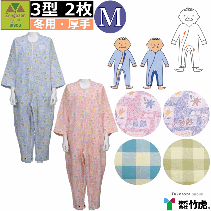 送料無料 介護用つなぎ型パジャマ フドーねまき3型 Mサイズ冬(厚手)用 2枚セット【楽天最安値に挑戦 男女兼用 介護服 介護パジャマ つなぎ 介護ねまき 上下続き服 寝巻 おむついじり防止 介護用つなぎパジャマ 拘束着 認知症 いたずら防止 竹虎ヒューマンケア】
