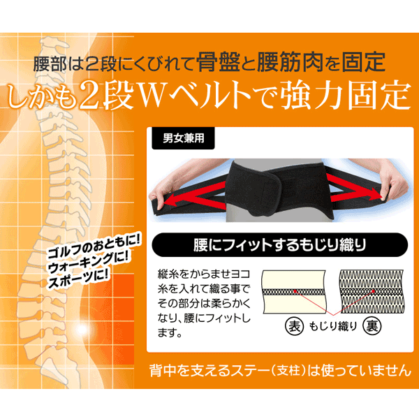製品特徴 ◯スポーツ時の体の負担の軽減や怪我の予防にも! ◯2重でしっかり腰を保護。