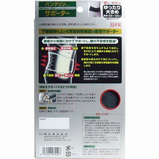 商品説明 「バンテリンコーワサポーター男性 腰用 ゆったり大きめ(LL)105-120cmブラック 1枚入」は、テーピング機能付サポーター(腰・腹用)です。